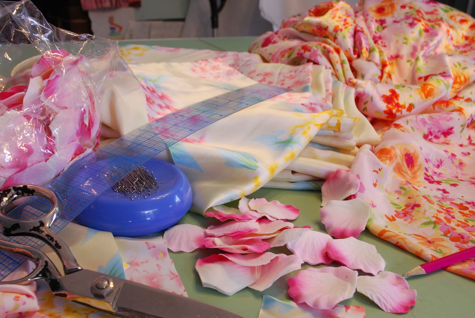 If I can't look outside for signs of spring, I'll try inside instead. In my studio, I pulled out 50 yards of pastel and floral prints that I bought in the Garment District in New York, last year. Why I haven't done anything with them yet, I can't imagine. But I was very glad to have their cheery prints flung over my table. I am going to sew up a spring.
