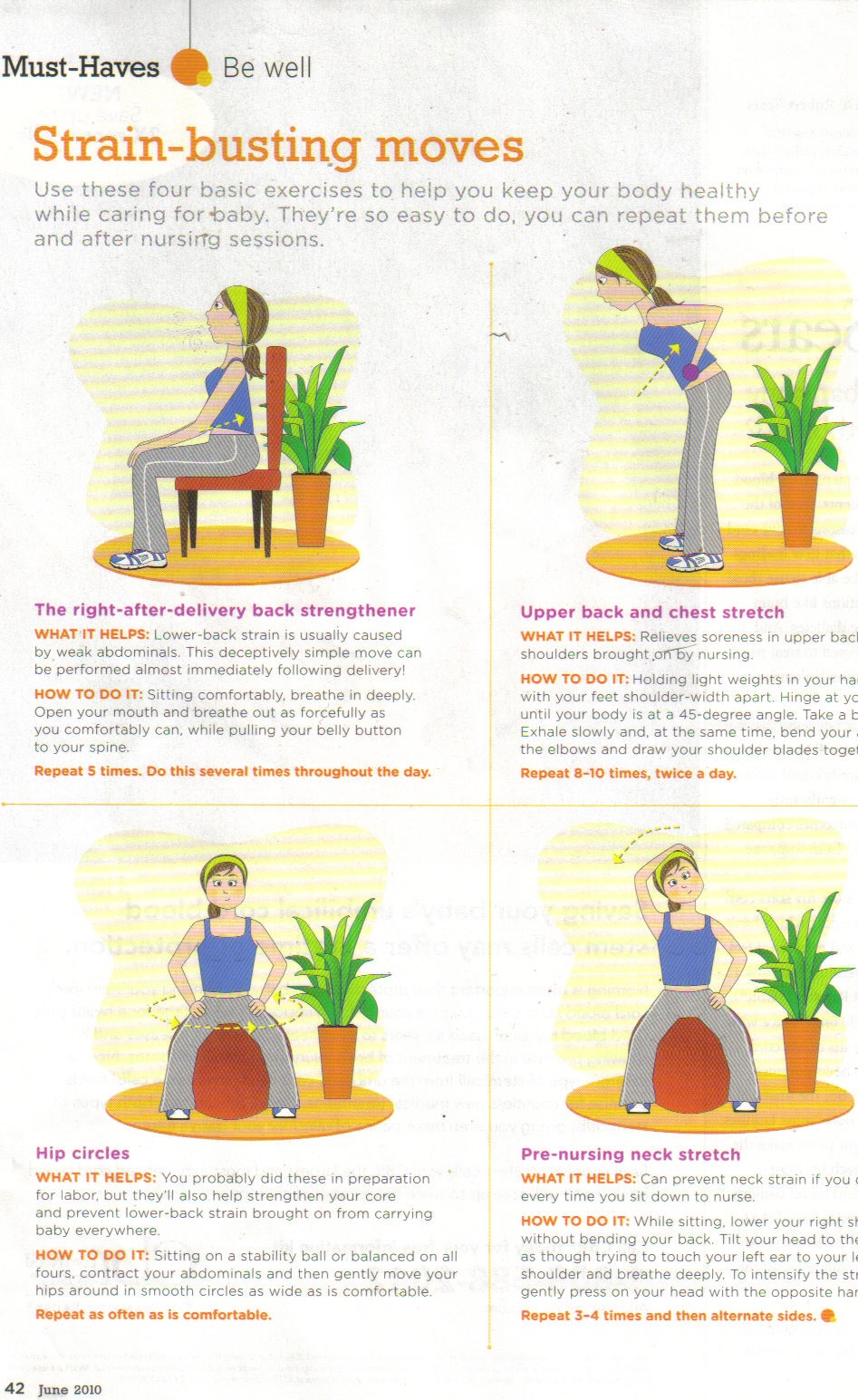 I have been suffering from back issues for what seems like 100 years, although actually I guess it started after the birth of my fist child 17 years ago...sigh...SO I invested in a yoga ball several months ago and I've been sitting on it at work - which helps TONS and then I've been doing basic stretching exercises when I get up in the mornings, which also helps - I found this chart in the new issue of Parenting Magazine this morning and I pulled the yoga ball out and gave it a whirl and I LOVE it - these few simple exercises make a world of difference!!! Enjoy!